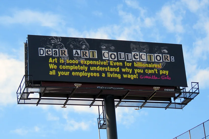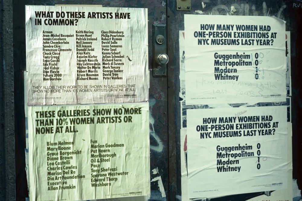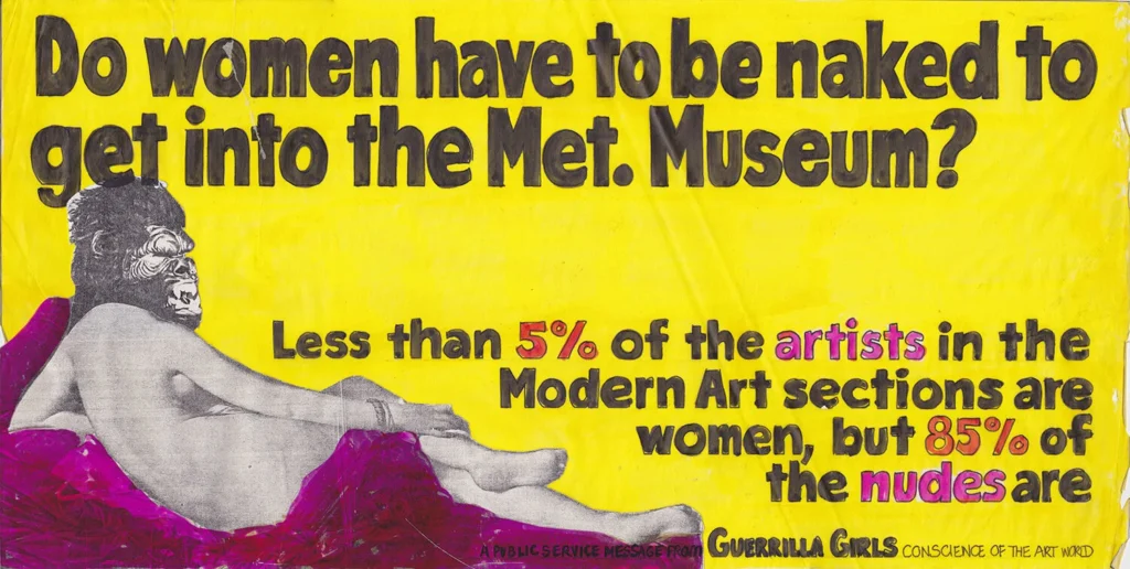 The group used advertising strategies early on to get their points across: catchy, bright posters, stickers, and billboards with humorous text and shocking statistics. They’ve called out specific galleries, artists, and collectors by name. They’ve done museum takeovers, exhibited all over the world, and fearlessly held not only art museums but also politicians, massive cultural institutions, and the film industry accountable for discrimination and abuse.
