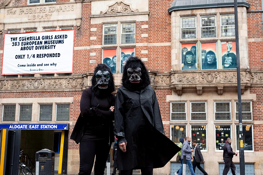 Over the past four decades, the Guerrilla Girls have remained anonymous. Each member chooses the name of a deceased female artist as a pseudonym, and when out in public for exhibitions, protests, marches, or other actions, each member disguises herself with a gorilla mask.