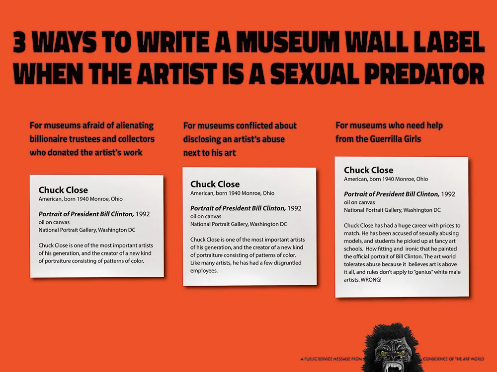 I think another large part of the group’s success is because of the humor. The humor has aged well, which… well, a lot of humor doesn’t necessarily stand the test of time. One of the pieces that I’m thinking of is the poster about museum wall text, where you asked how we are supposed to write wall text for an artist who is an alleged or confirmed sexual predator. And you used Chuck Close as an example. The first time I saw it, it just struck me as so darkly funny. Can you talk a little bit about the humor of your work over the years?