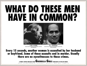 It’s so iconic. I’ve been an artist my whole life, and the number of “The Advantages of Being a Woman Artist” items I have been given—I could open my own merch store. I love it. I’m always happy to receive another one. That work might have been my introduction to the Guerrilla Girls years ago, but it also might have been that piece you did with Carl Andre and O.J. Simpson, because Ana Mendieta is one of my favorite artists.