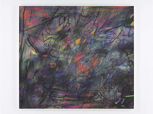 Tawney’s Spirit River and Mehretu’s Sun Ship are skeleton keys to an undercurrent that tethers both shows into a conversation about the power of physical material to mediate radical encounters with presence and transcendence. The title of Mehretu’s Sun Ship (J.C.) references the John Coltrane record of the same name from his late-period output of cosmically ambitious jazz spirituals. There is music within Mehretu’s canvas, a synesthetic encounter with ink and acrylic chords and scales akin to the diffuse yet detectable melodies embedded in Coltrane’s frenzied solos. Materiality generates a paradox of its own in Spirit River, where black and subtly evocative purple linen produces a hallucinatory glow, mimicking the liquidity of flowing water.